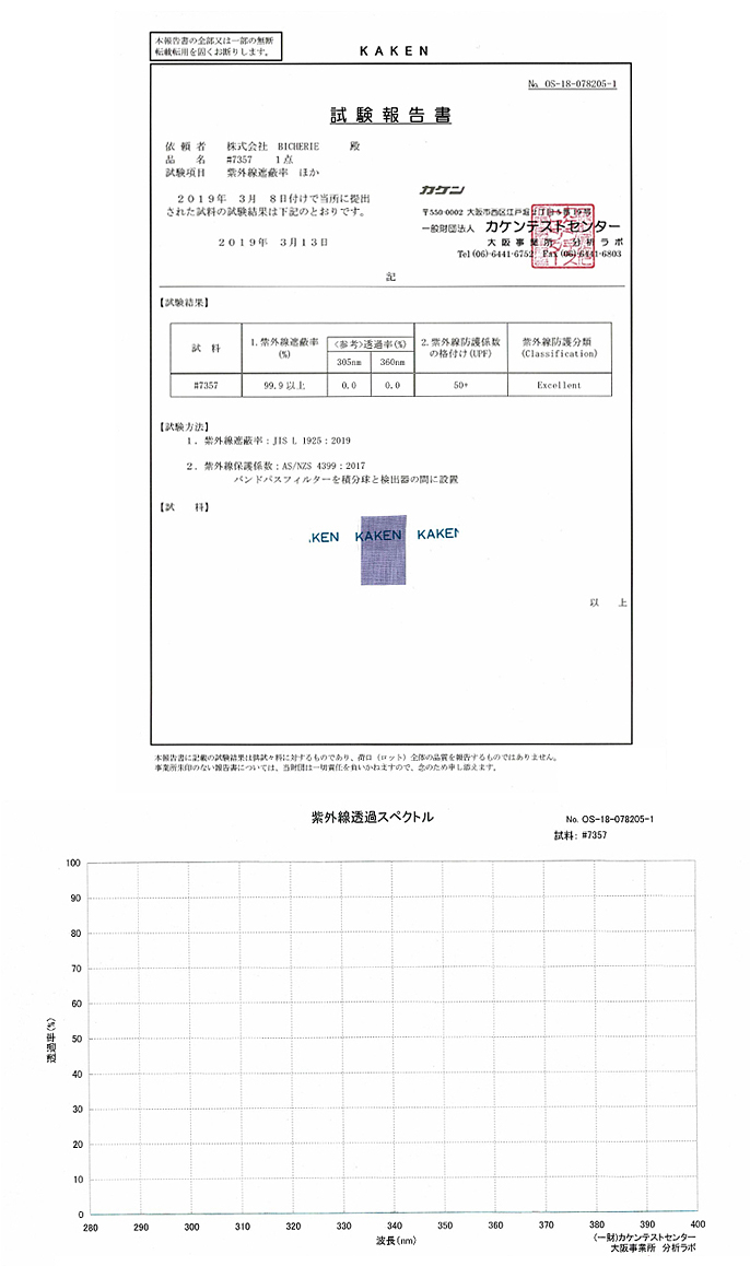 BICHERIE.の日傘、帽子(庇裏)生地は全て、一般財団法人カケンテストセンターに試験を依頼し遮光率の他にも、遮蔽率、遮熱性 の試験証明書を頂いております。