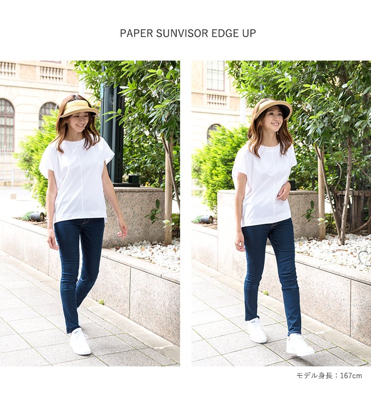 小顔・小頭に見えるようこだわり、更にさりげない細かなデザイン性で、もちろん個人差はございますが、より多くの方に合うようお作りしたペーパーバイザーです。